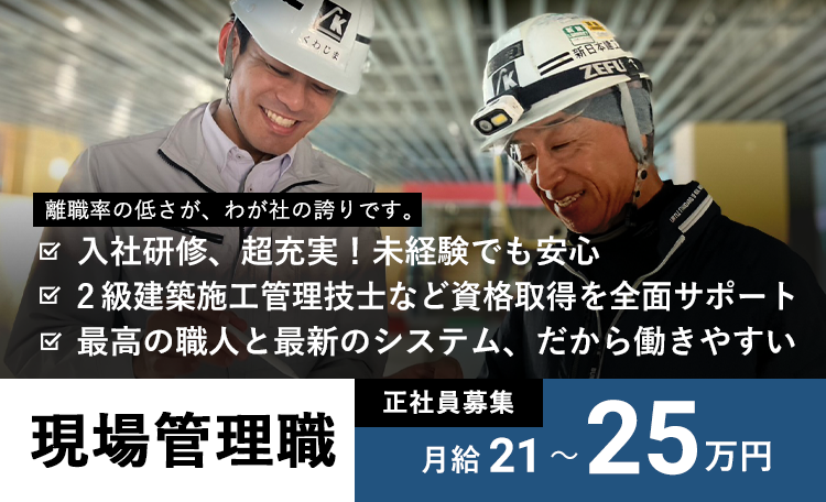 当社では若手の教育、研修、育成にかなり力を入れております。業界未経験者でもまずは安心して飛び込んできてください。面倒見の良い先輩たちが丁寧に教えてくれる環境、挑戦できる環境が新日本建工にはあります‼